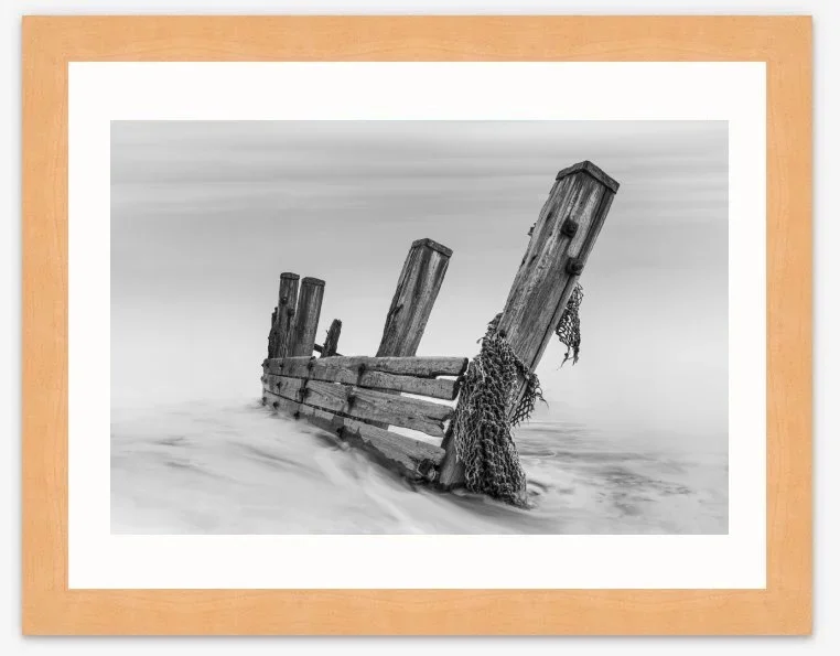 “The remains of coastal defences at Spurn Point on the east Yorkshire coast, presented as a simple minimalist monochrome image”